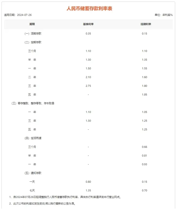 具體來看,招商銀行調(diào)整后的人民幣存款掛牌利率與六大銀行保持一致。活期存款年利率由0.20%調(diào)整為0.15%,下調(diào)5個基點;整存整取定期存款三個月、六個月、一年期由1.15%、1.35%、1.45%調(diào)整為1.05%、1.25%、1.35%,均下調(diào)10個基點;二年、三年、五年期由1.65%、1.95%、2.00%調(diào)整為1.45%、1.75%、1.80%,均下調(diào)20個基點。