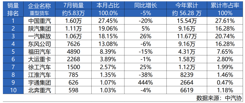 根據中汽協最新數據,2024年7月我國重卡市場銷售約5.9萬輛(批發口徑,包含出口和新能源),環比下降17%,同比下降4%,減少約2000輛。在傳統銷售淡季與多重市場挑戰交織的背景下,中國重汽以扛鼎之姿衛冕7月重卡市場銷量冠軍,彰顯了其一貫的行業領先實力,用銷量數據書寫了“淡季不淡”的卓然篇章。 統計顯示,中國重汽7月重卡銷量1.6萬輛,穩居行業榜首,同時,其1-7月累計銷售約15.54萬輛,同比增長4%,市場占有率攀升至27.6%,這一逆市上揚的強勁增長態勢,無疑是對中國重汽行業技術領先地位和產品卓越實力的最佳注解。