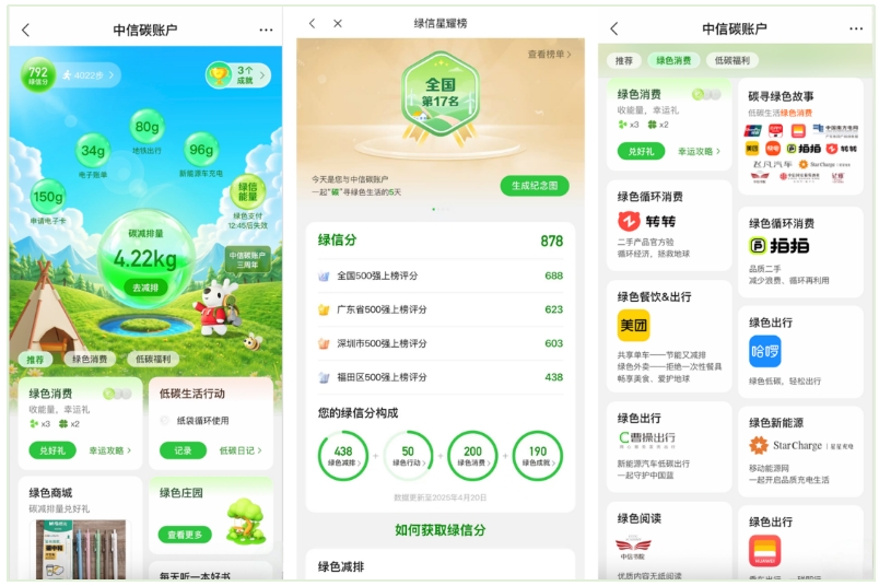 2025年4月22日是第56個世界地球日,宣傳主題為“珍愛地球 人與自然和諧共生”,國內首個由銀行主導推出的個人碳賬戶——“中信碳賬戶”迎來上線3周年。值此之際,在深圳市生態環境局指導下,中信銀行信用卡聯合中匯信碳資產管理有限公司,基于“中信碳賬戶”實踐成果,推出全國首個無紙化金融場景(銀行業)碳普惠方法學,致力于以更完善、更科學的行業標準建設,助力綠色金融高質量發展。同時,“中信碳賬戶”持續煥新升級,進一步提升大眾綠色消費的體驗感、獲得感,助力釋放綠色可持續消費潛力,據中信銀行可持續發展報告數據顯示,“中信碳賬戶”全國用戶已超過2150萬。 標準引領 做好綠色金融大文章 日前,中國人民銀行深圳市分行聯合深圳金融監管局、深圳證監局、深圳市地方金融管理局等部門印發《關于統籌做好深圳綠色金融大文章 支持碳達峰試點城市建設的行動方案》,強調要加強標準建設,研究綠色普惠等特色領域綠色金融界定標準,推進粵港澳大灣區綠色金融標準共建和互認。自2013年6月開市以來,作為全國首個啟動交易的試點市場,深圳碳市場穩健運行十余年。深圳碳普惠機制是碳市場的重要補充,是以商業激勵、政策鼓勵和核證減排量交易相結合的正向引導的自愿減排機制。自2021年深圳市人民政府辦公廳印發《深圳碳普惠體系建設工作方案》起,深圳市已發布6份碳普惠方法學,形成較為完整的制度標準體系。 早在2021年,中信銀行信用卡中心積極響應政府號召,圍繞城市碳普惠機制建設,率先開啟金融碳減排場景方法學探索。2022年“中信碳賬戶”正式上線以來,中信銀行信用卡充分發揮綠色金融先發優勢,以“中信碳賬戶”為核心,探索研究電子借記卡、電子信用卡、電子賬單、線上繳費、線上貸款、線上還款、線上轉賬等銀行業無紙化金融場景碳減排量的科學計量方法,為金融行業碳普惠標準建設提供實踐依據。 基于近三年間的實踐經驗積累和方法學持續研發,中信銀行信用卡中心主導編制的《深圳市無紙化金融場景(銀行業)碳普惠方法學》(以下簡稱《方法學》)。于去年11月通過深圳市生態環境局立項評審并在官網公示。此后,中信銀行信用卡中心聯合中匯信碳資產管理有限公司扎實推進《方法學》的修訂和完善,組織多輪技術研討,通過深圳市生態環境局組織的專家評估,即將發布并成為全國首個銀行業無紙化金融場景的碳普惠方法學,將大力促進“金融業務數字化-碳減排量核算-碳資產價值化”的全鏈路標準化,豐富碳普惠體系建設,助力行業和社會可持續發展,打造綠色金融創新的“中信樣本”。 目前,“中信碳賬戶”依據該《方法學》對電子借記卡、電子信用卡、電子賬單、線上繳費、線上貸款、線上還款、線上轉賬7類場景的碳減排量進行科學量化,為廣大用戶提供碳賬戶開通、核算、累計、查詢、兌換等功能服務,真正成為用戶的“綠色賬戶”,實現低碳行為數字化、可視化、資產化和價值化,積極引導社會公眾的綠色消費轉型。 體驗升級 全新“綠信分”激發綠色消費活力 “中信碳賬戶”正式上線3周年以來,持續升級功能體驗,增強用戶激勵,提升用戶參與綠色生活的獲得感,近期上線全新“綠信分”體系,從四大維度綜合記錄用戶綠色生活足跡,通過區域環保榜單給予用戶綠色榮譽激勵,為綠色生活增添成就感。