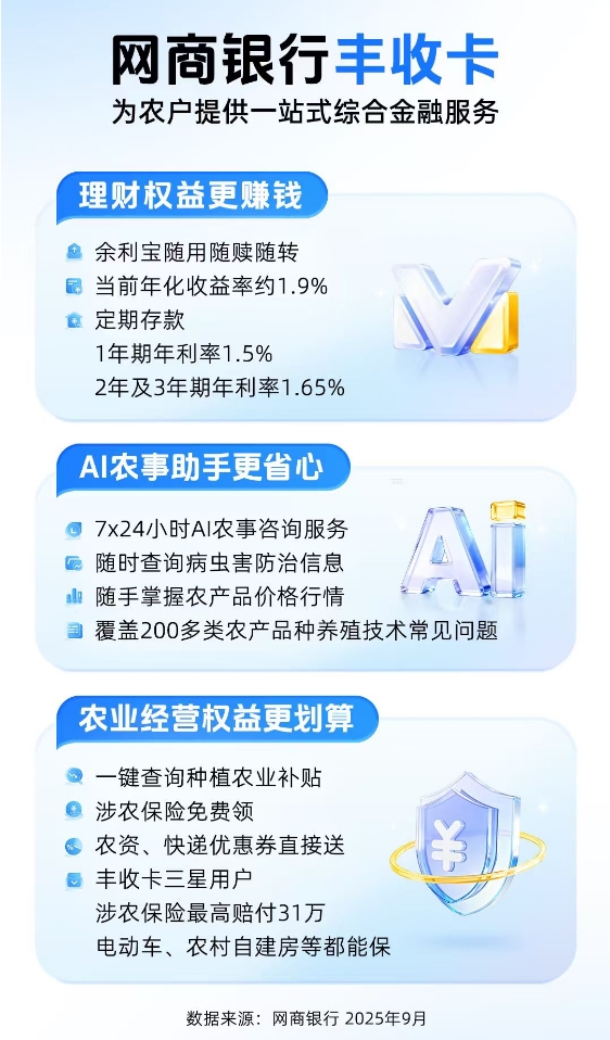 合作內容主要包括兩方面:一是雙方將通過政策引導、資源協調等方式,優先在山東特色產業主產區推廣豐收卡,方便農戶掃碼開通和使用;二是依托網商銀行的大數據風控能力,為山東省內種養大戶、農業企業、鄉村帶頭人、新型職業農民等群體提供更靈活的信貸服務。 記者獲悉,豐收卡整合了存款、理財、信貸、AI農事助手以及多項免費助農權益,全面滿足農戶多樣化生產經營需求!癆I農事助手”相當于一位24小時在線的“農技專家”,并接入1000名專家在線支持,可實時解答200多種種植作物、家禽家畜的種養問題,還可提供災害預警、天氣提醒和農產品價格查詢等功能,幫助農戶告別“憑經驗種地、靠天吃飯”的傳統模式。 招遠葡萄種植戶劉旭峰說:“以前擔心天氣病害、價格波動,現在擁有了豐收卡,手機一點就有辦法,種地越來越有信心。” 在資金管理方面,為響應國家提升農民財產性收入的號召,豐收卡推出了定期存款、靈活理財等多種產品,更好匹配農業生產周期和資金使用節奏,切實緩解農戶“理財難、管錢難”的問題。此外,網商銀行還將與山東省農業農村廳在設施農業、海洋漁業等領域深化產業金融合作,為各地搭建授信模型,進一步擴大普惠金融服務的覆蓋范圍。