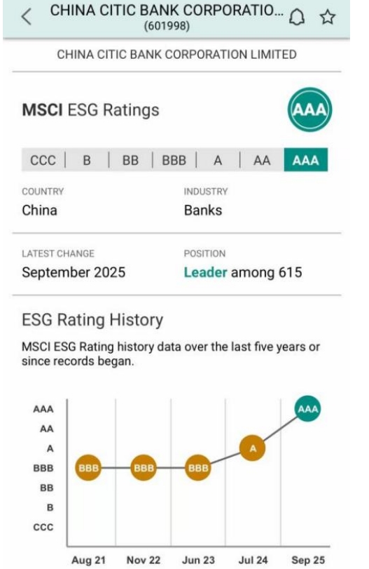 明晟(MSCI)是全球領先的金融指數和ESG評級機構,每年對全球7000余家上市公司的ESG實踐開展分析和評級,其ESG評級體系深受全球投資機構認可,評級結果成為全球投資數據分析與投資決策的重要依據。MSCI評級報告顯示,過去一年中信銀行在消費者權益保護、隱私與數據安全、人力資本發展、金融服務可及性、公司行為和公司治理等實質性議題表現方面提升顯著。本次評級提升反映出國際權威機構對中信銀行ESG管理水平和綜合表現的高度認可,更體現出資本市場對中信銀行可持續發展價值的充分肯定。 近年來,中信銀行深刻把握時代命題,積極響應國家“雙碳”戰略,深入貫徹新發展理念,秉持“穩健、均衡、可持續”原則,致力于將可持續發展理念內化于企業發展的戰略基因,以全面建設成為“有擔當、有價值、有特色、有溫度”的“四有”銀行、跨入世界一流銀行競爭前列為發展愿景,構建具有前瞻性、系統性和實踐性的可持續發展框架,探索兼具中國特色與全球視野的金融可持續發展路徑,努力實現社會價值與經濟價值的統一、功能性與盈利性的平衡,為金融高質量發展貢獻中信智慧與力量。 下一步,中信銀行將繼續踐行金融工作的政治性、人民性,全方位、多角度穩步推進ESG理念融入日常經營管理,著力構建具有中信銀行特色的ESG管理體系,積極提升自身價值創造能力與可持續發展能力,高質量作答金融“五篇大文章”,堅定不移走好中國特色金融發展之路,為股東、社會及各利益相關方創造更大價值。