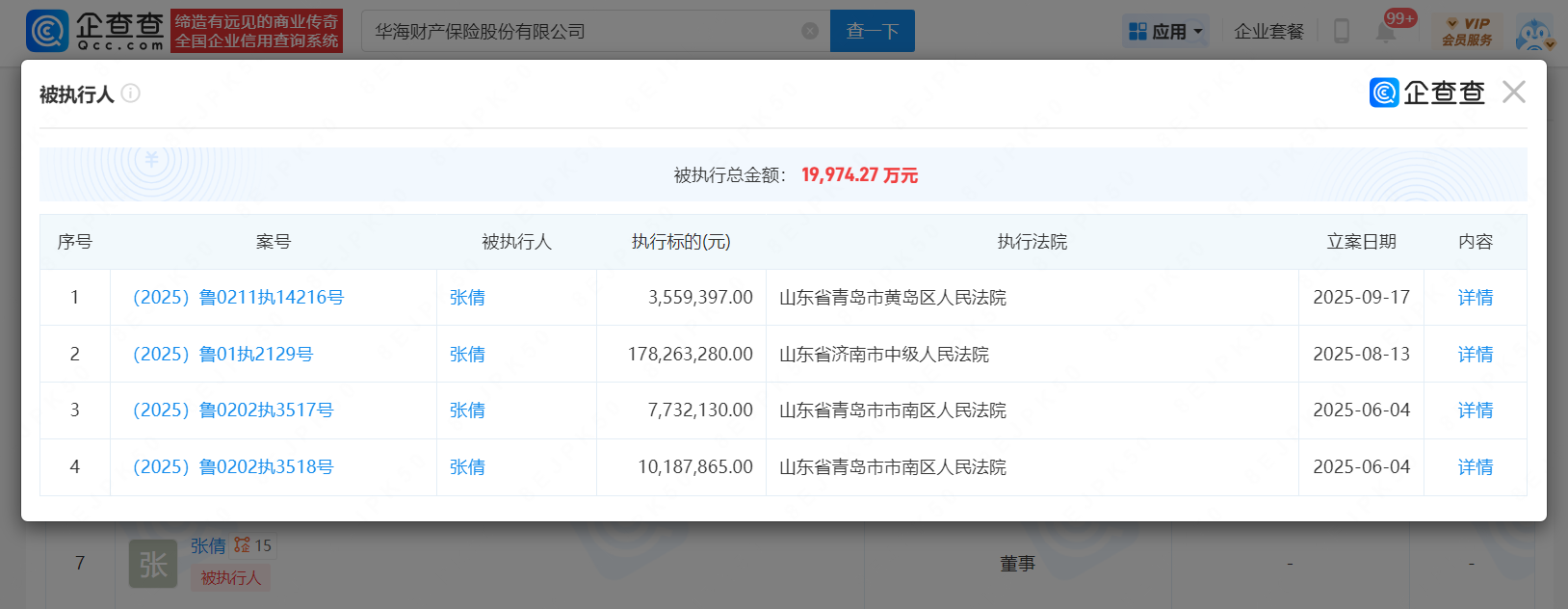 企查查信息顯示,9月17日,華海財產(chǎn)保險股份有限公司(簡稱“華海財險”)董事張倩被青島市黃島區(qū)人民法院立案執(zhí)行,執(zhí)行標的355.94萬元。 據(jù)悉,這并非張倩首次被立案執(zhí)行。8月13日,張倩被濟南市中級人民法院立案執(zhí)行,執(zhí)行標的高達1.78億元。而自今年6月份以來,張倩已4次被法院列入被執(zhí)行人,被執(zhí)行總金額約2億元。